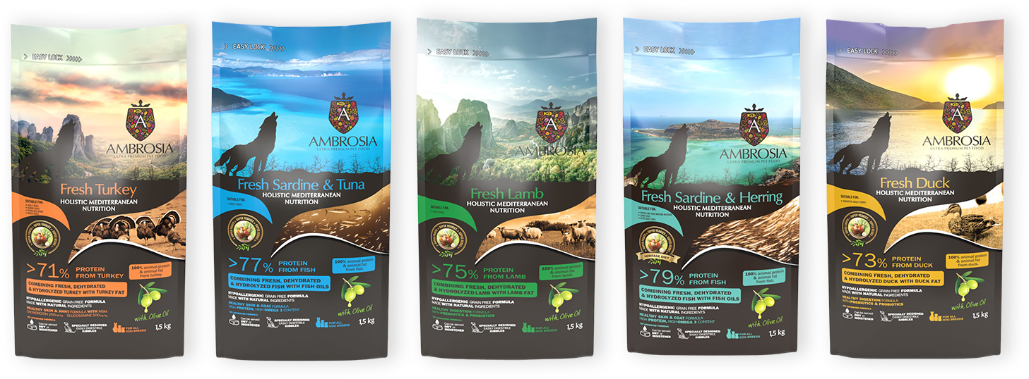 古代ギリシャから伝わる地中海食の原則に基づき、パートナーの健康長寿を目指したウルトラプレミアムフードです。アンブロシアは地中海食の特徴である「オリーブオイル」や「ハーブ」を上手に使うことで、不足しがちな栄養素を美味しく調理し、パートナーの健康維持に一番重要な「毎日の栄養バランス」を整えます。