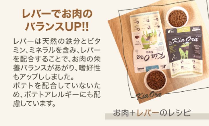 Kia Ora®は、世界的に優れた品質として定評があるニュージーランド産の肉原材料にこだわり、BACK TO BASICS®のコンセプトに従い、犬とは、猫とは本来どういう動物なのか、という原点に立って、科学的な視点で本質を追及したドッグフードです。