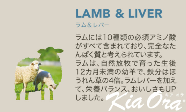 Kia Ora®が使用するラムは、自然放牧で育った生後12ヶ月未満の幼羊で、ビタミンB1、B2、Eが豊富で、栄養がスムーズに変換されるのを助けます。