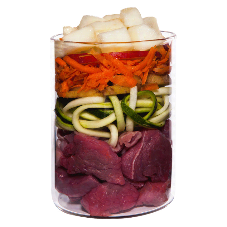 仔牛の心臓(25%)、仔牛の肺(12%)、仔牛の脂肪(7%)、じゃがいも、人参(8%)、ズッキーニ、カボチャ(8%)、メロン、リンゴ、亜麻仁油、ココナッツ粉、ダンデライオン(タンポポ)、バーチリーフ、パセリ、チアシード、カレンデュラ、イラクサ、オイスターシェル、海藻、ビタミン(A、D3、E、B1、B2、B12)、ビオチン、パントテン酸、葉酸、銅、マンガン、ヨウ素、亜鉛、セレン、カルシウム、リン、マグネシウム、ナトリウム、L-カルニチン