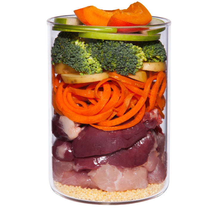 新鮮で品質の高い七面鳥肉に野菜・果物・海藻・疑似穀物のキビ等、愛犬の健康維持に必要なバランスの取れた手作り食の理想形を便利な1缶にしました。