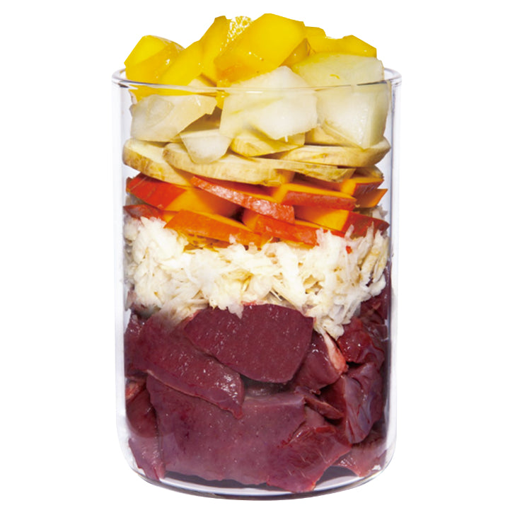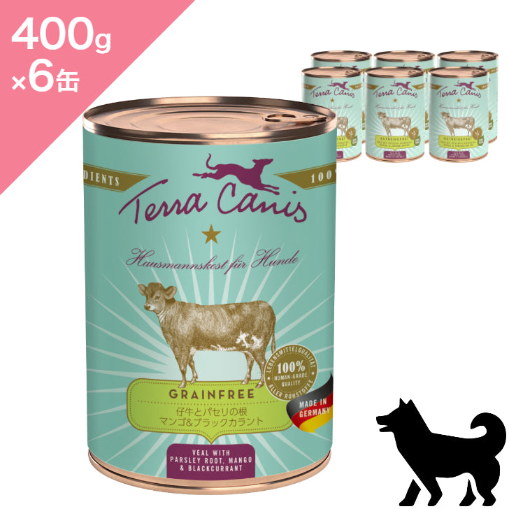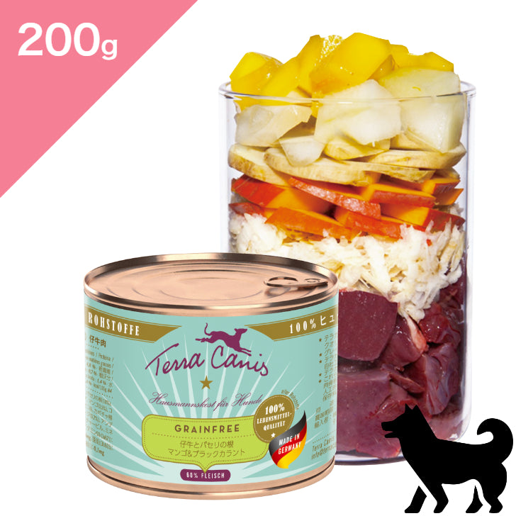 穀物や乳製品の食物アレルギーや消化吸収に配慮したメニューです。仔牛肉・野菜・果物など愛犬の健康維持に必要なバランスの取れた手作り食の理想形を便利な1缶にしました。