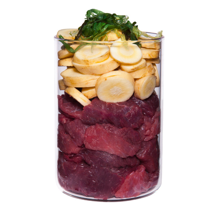 ダチョウの筋肉(60%) 、パースニップ (36%) 、亜麻仁油、レープシードオイル、海藻、ビタミン・ミネラル類(A、D3、E、B1、B2、B12、ビオチン、パントテン酸、葉酸、銅、マンガン、ヨウ素、亜鉛、セレン)