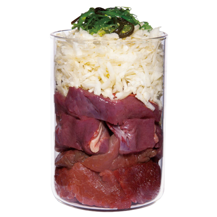 馬の筋肉 (60%) 、エルサレムアーティチョーク(キクイモ) (36%) 、亜麻仁油、レープシードオイル、海藻、ビタミン・ミネラル類 (A、D3、E、B1、B2、B12、ビオチン、パントテン酸、葉酸、銅、マンガン、ヨウ素、亜鉛、セレン)