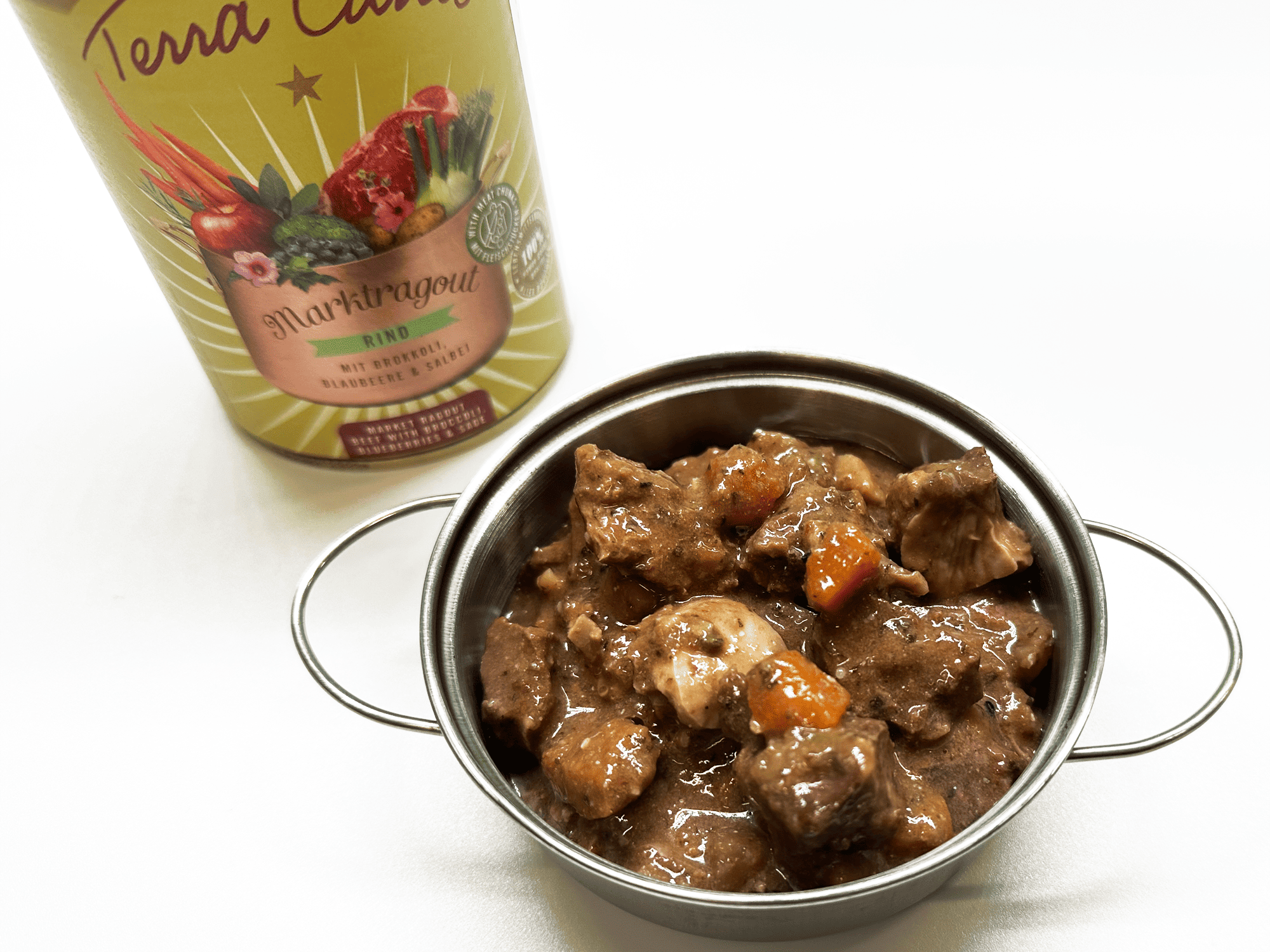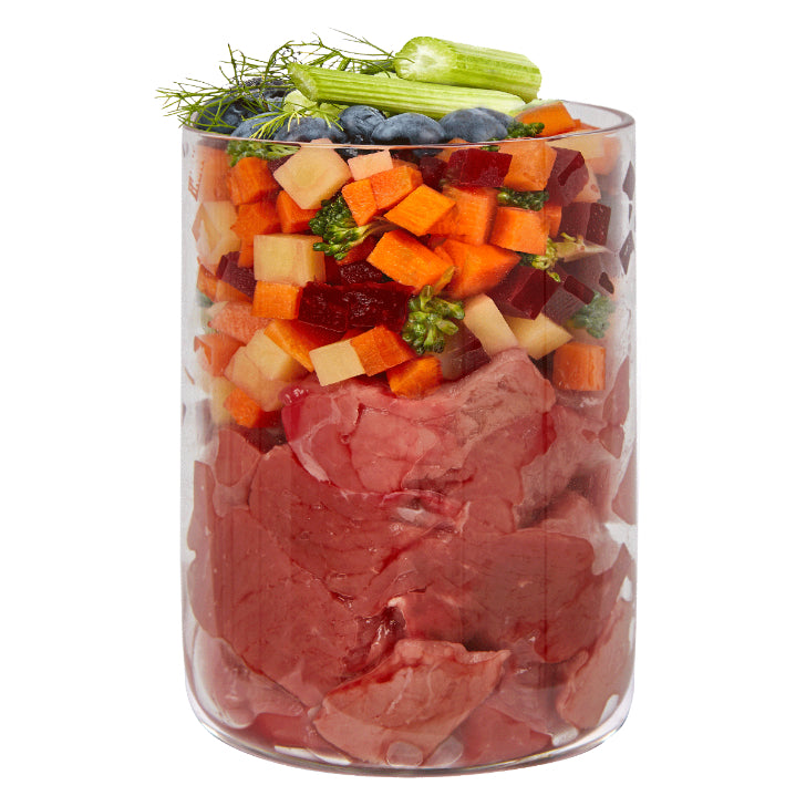 牛の心臓の筋肉(43%)、牛の筋肉(グヤーシュ肉)(16%)、にんじん(11%)、じゃがいも(9%)、ブロッコ リー(4%)、ビーツ、さつまいも、リンゴ、フェンネル(2%)、ブルーベリー(0.5%)、レープシードオイル、ココナッツ粉、ビール酵母、オイスターシェル、セージ、(0.1%)、タラゴン(0.1%)、ハイビスカス(0.1%)、チャービル (0.1%)、ゴマ、ミネラルクレイ、アンデスソルト、海藻、ミネラル類 乾燥