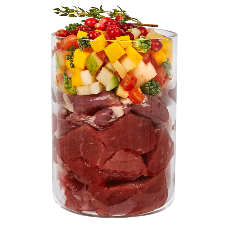 鶏の心臓(34%)、鹿の筋肉(グヤーシュ肉)(27%)、カボチャ(10%)、じゃがいも(7%)、洋ナシ(5%)、ブロッコリー(5%)、トマト、さつまいも、クランベリー(0.4%)、レープシードオイル、ココナッツ粉、ビール酵母、オイスターシェル、アセロラ、ダンデライオン、カモミール(0.1%)、タイム(0.1%)、セイボリー(0.1%)、ミネラルクレイ、アンデスソルト、海藻、ミネラル類 乾燥