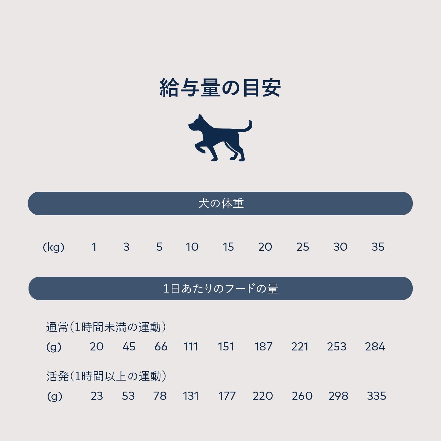 ※給与量の目安:犬にも個体差があるため、運動量や年齢によって必要な食事の量は異なります。与え始めはパッケージ裏面の表を参考にし、その後必要に応じて給与量を調節してください。