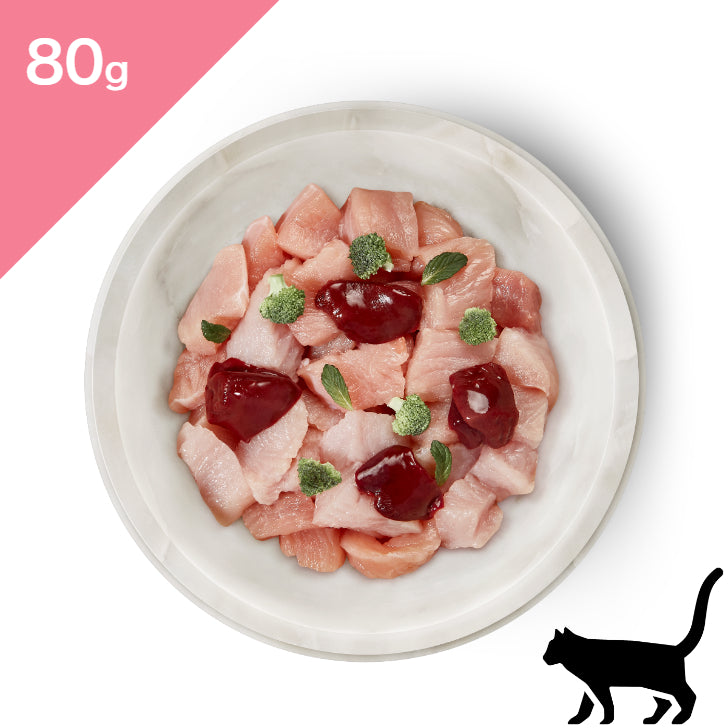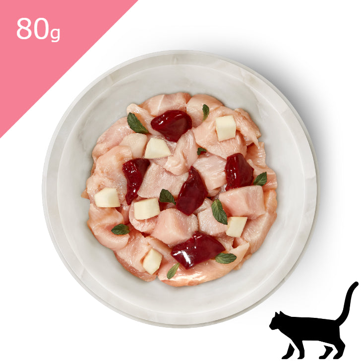 鶏の心臓 (30%), 鶏の胃(26%), 鶏の皮(14%), 鶏の筋肉 (10%), 鶏レバー(10%), バターナッツスカッシュ (4%), トマト, 菜種油, キャットニップ, ミネラル類