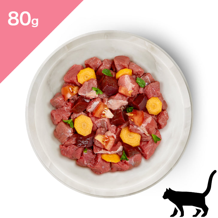 牛の心臓 (58%), 牛の肺 (14%), 牛レバー (14%), 仔牛の肉(4%), 人参 (4%), トマト, 菜種油, キャットニップ, ミネラル類