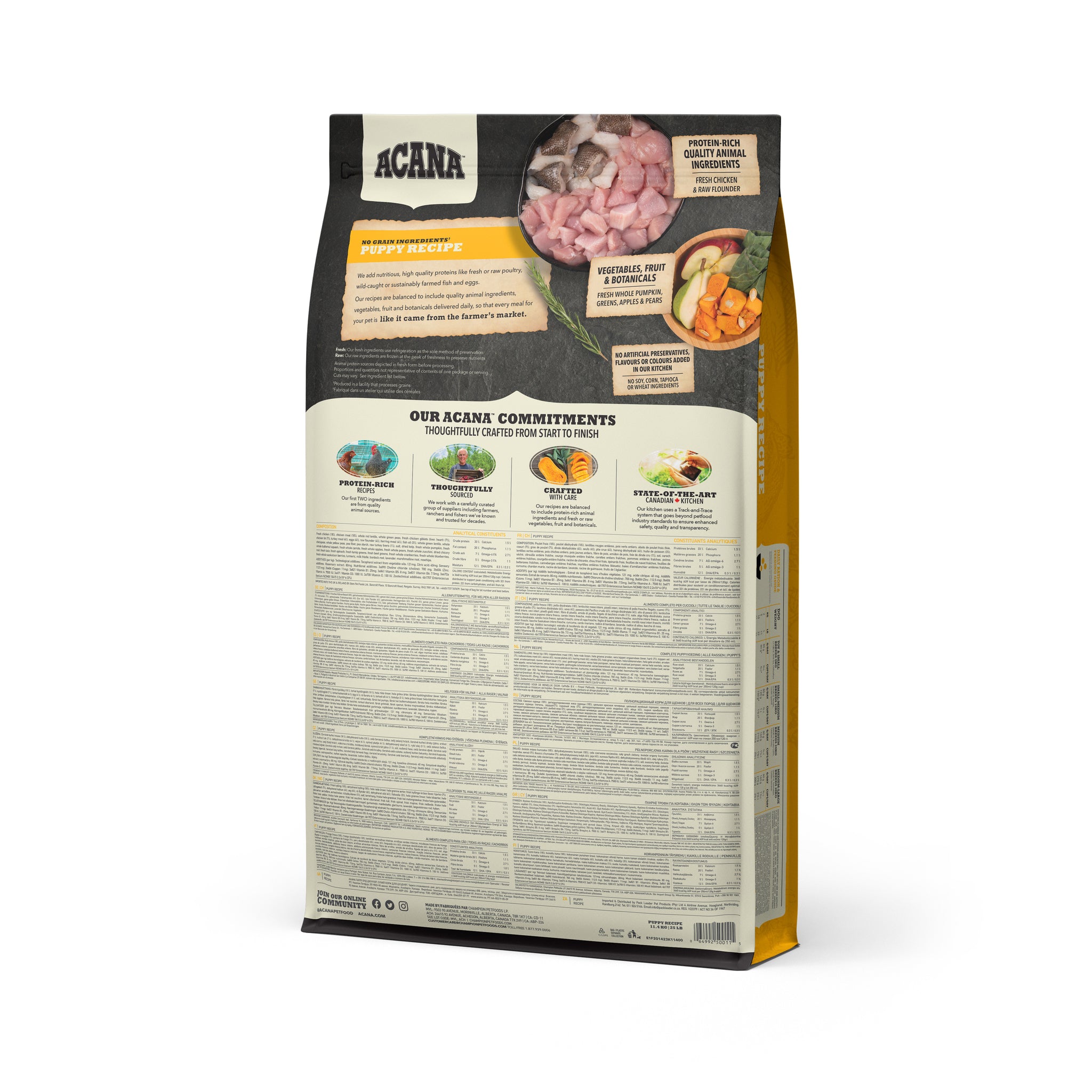 放し飼い鶏肉、巣に産み落とされた卵、天然カレイをたっぷり使用し、子犬の健康的な成長をサポートする栄養が豊富に含まれます。子犬は肉食です